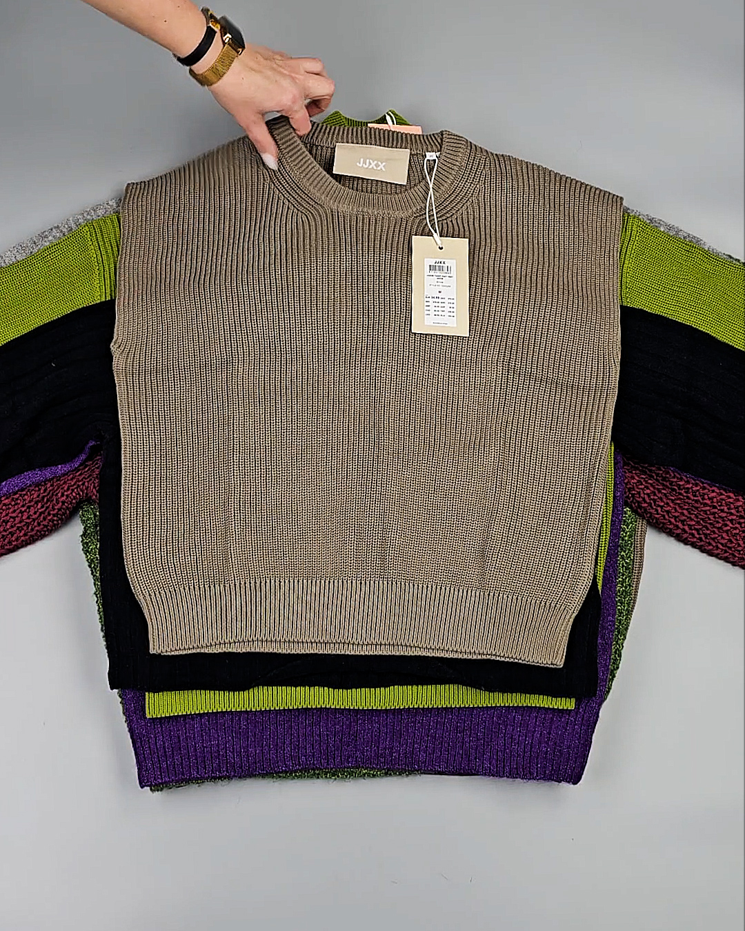 Среди нашего ассортимента всегда в наличии Сток в количестве более 450 тонн. Каждую неделю новые привозы из Европы, в том числе источником оптовых поставок бренда JJXX является ДАНИЯ.